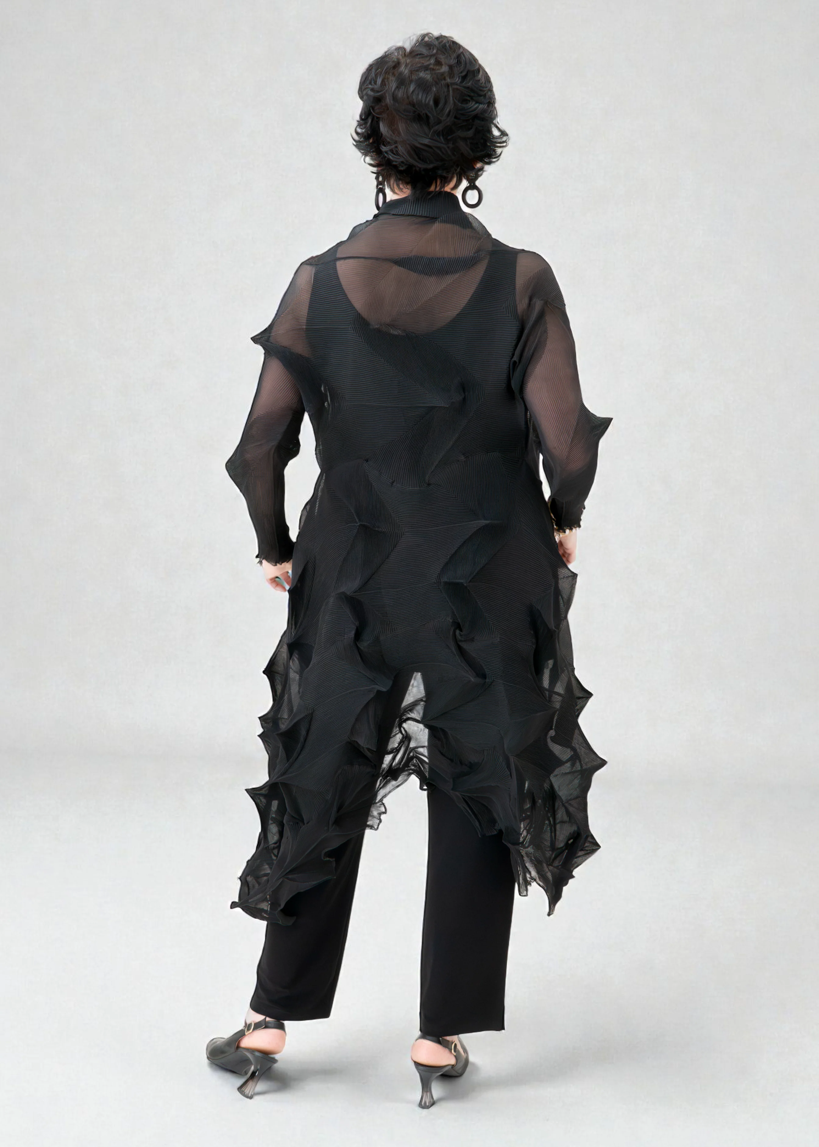 The material of the long Jacqui Coat creates an organic anatomic profile. A wonderful garment that creates a life of its own.