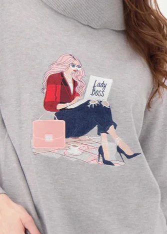 Elevate your wardrobe with this sophisticated cowl neckline sweater that seamlessly blends comfort and confidence. The playful "Lady Boss" graphic adds a touch of personality to the refined silhouette, while the back lacing detail creates visual interest from every angle