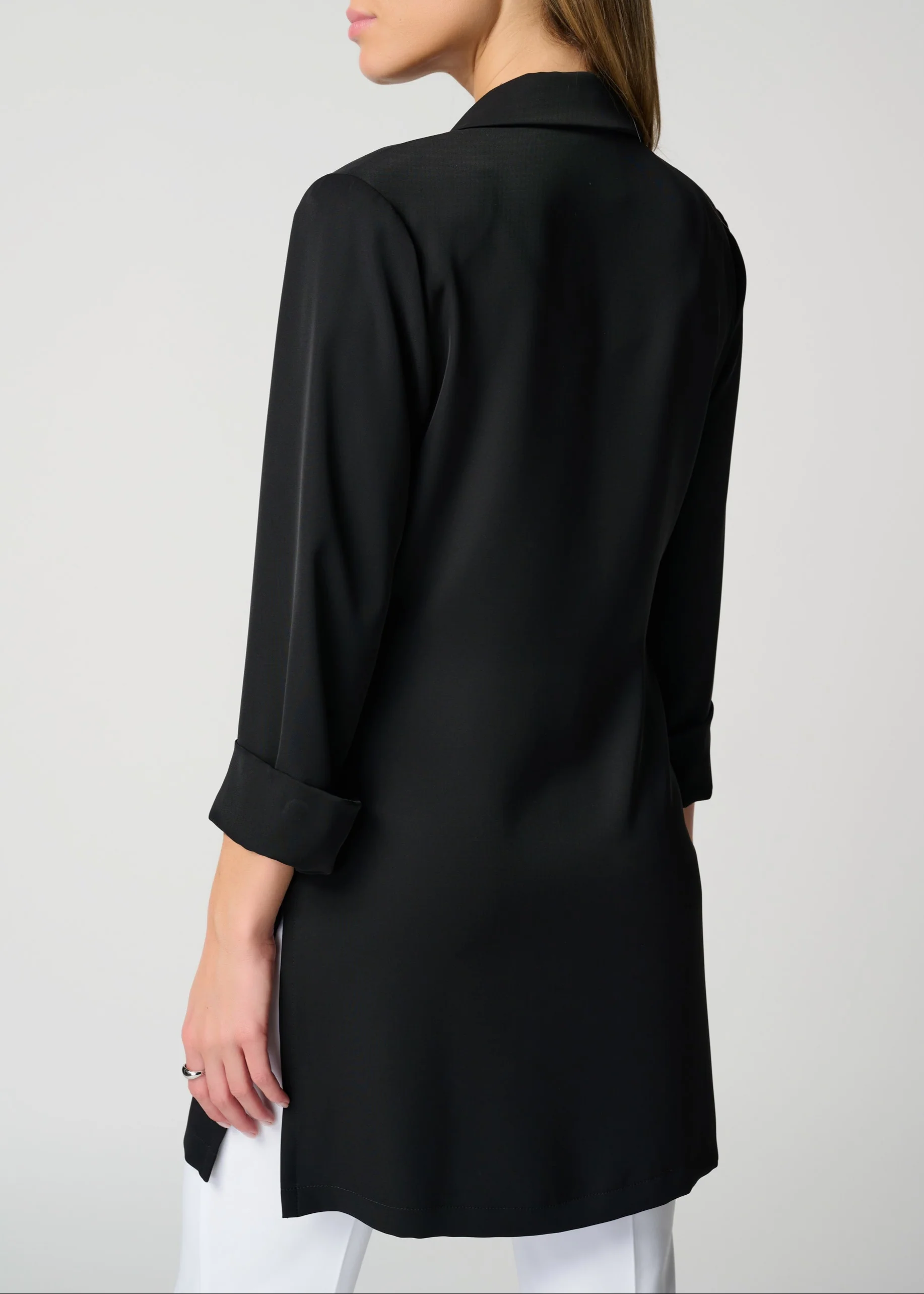 Add a touch of soft tailoring to your outfit with a longline blazer. The flowy matte twill fabric with a side slit creates a relaxed feel, while the notched collar and three-quarter cuffed sleeves provide structure to this modern blazer. (Copyright Joseph Ribkoff 2025)