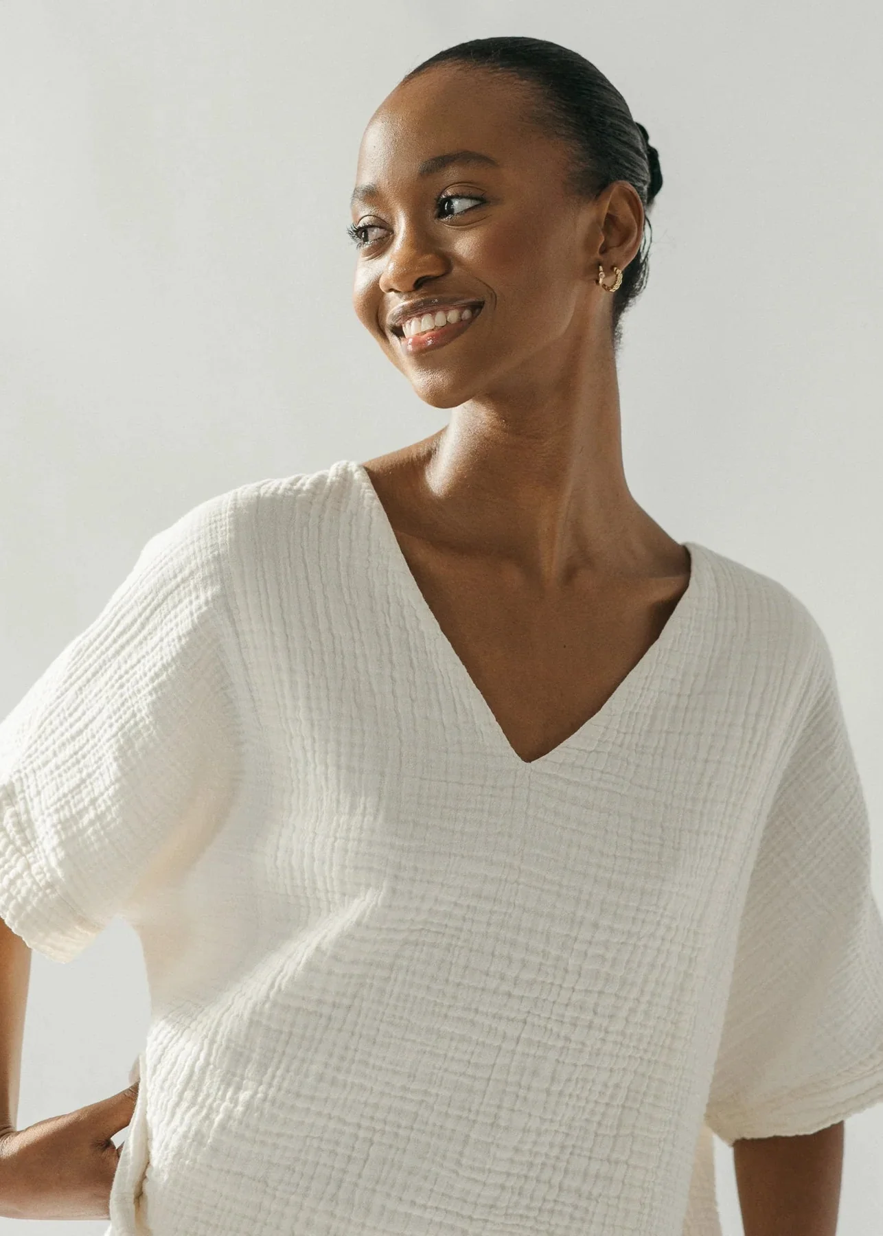 The crinkle muslin texture is incredibly soft on the skin, and feels lightweight, yet substantial when worn. This piece features an oversized fit, half length sleeves and a v shaped neckline. Flattering on all body types, allowing freedom of movement and comfort - everyday elegance without the effort. (Copyright Pokoloko 2025)
